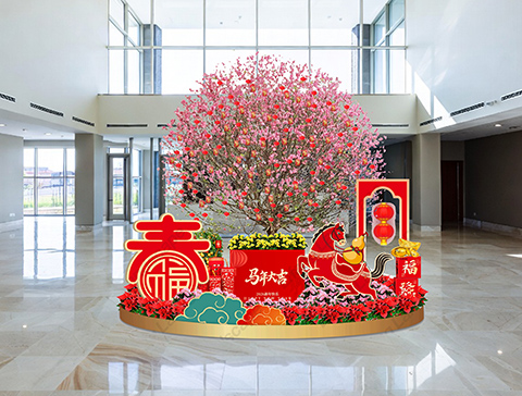 作为春节传统年花,桃花寓意生机勃发、事业繁荣。方案中结合桃花推出系列定制造景,可根据企业环境与风水布局进行灵活设计与摆放,在美化空间、净化空气的同时,也寄托对企业新年发展兴旺的美好祝愿。