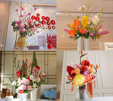 另外,我们设计了多款采用环保材质的仿真花组合造景,每一组作品均匠心独运,洋溢喜庆节日气息。无论是写字楼大堂、公司前台,还是酒店大堂,皆能为您打造一个喜庆盎然、生机勃勃的迎宾环境。精心的布置蕴含着对新春的美好祈愿,让人们在赏花之余,亦能感受到浓浓的年味与暖意。