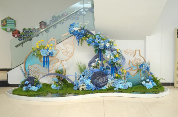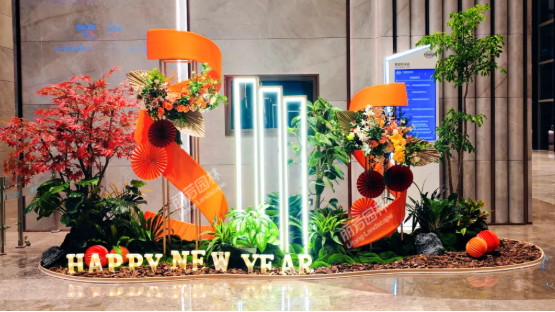 结合大堂开阔格局,我们以错落有致的绿植为基底,点缀以灯笼、橙色缎带等喜庆元素,巧妙融入温暖灯光。整体造景视觉吸睛、气氛欢腾,令人眼前一亮,瞬间点燃节日的喜悦情绪。