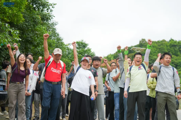 山间回荡着团队的加油声与欢笑声,有人搀扶体力不支的同伴,有人带头高歌鼓舞士气。最后,全员成功抵达终点,汗水中映照出“团结、协作、拼搏”的丽芳精神。