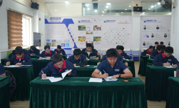 理论考试环节着重考查专业知识的深度与广度,内容覆盖企业文化、安全生产规范、项目管理流程、室内绿植与户外园林养护等关键领域,并重点检验现场管理人员在工伤管理、客情维护与回款管理等方面的实操能力。整场考试不仅全面评估了参赛人员的理论功底,更考验其在复杂情境中灵活运用知识解决实际问题的能力。考场之上,大家全神贯注、沉着应答,递交出一份份凝聚专业实力的答卷。