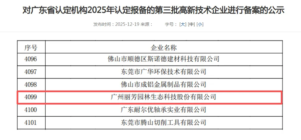 新年伊始,喜讯连连!近日,全国高新技术企业认定管理工作领导小组办公室公示了广东省2025年第三批高新技术企业备案名单。丽芳园林凭借在园林智能化服务领域持续的技术研发投入、突出的创新能力和显著的成果转化成效,顺利通过2025年度国家高新技术企业复审认定。