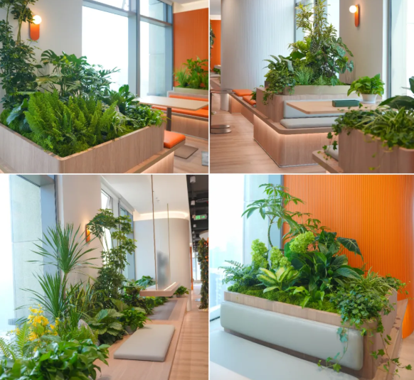 针对该金融公司,我们“因地制宜”设计植物造景,在办公区与天台空间,我们打造“自然栖居”主题布置。公共区域以植物造景提升氛围与舒适度;卡座区域融合生活美学;天台则依光照条件搭配沙生植物造景和健康景观花卉造景,遵循高低错落、疏密有致原则,为都市工作者提供一方质感与静谧并存的康养精神栖所。
